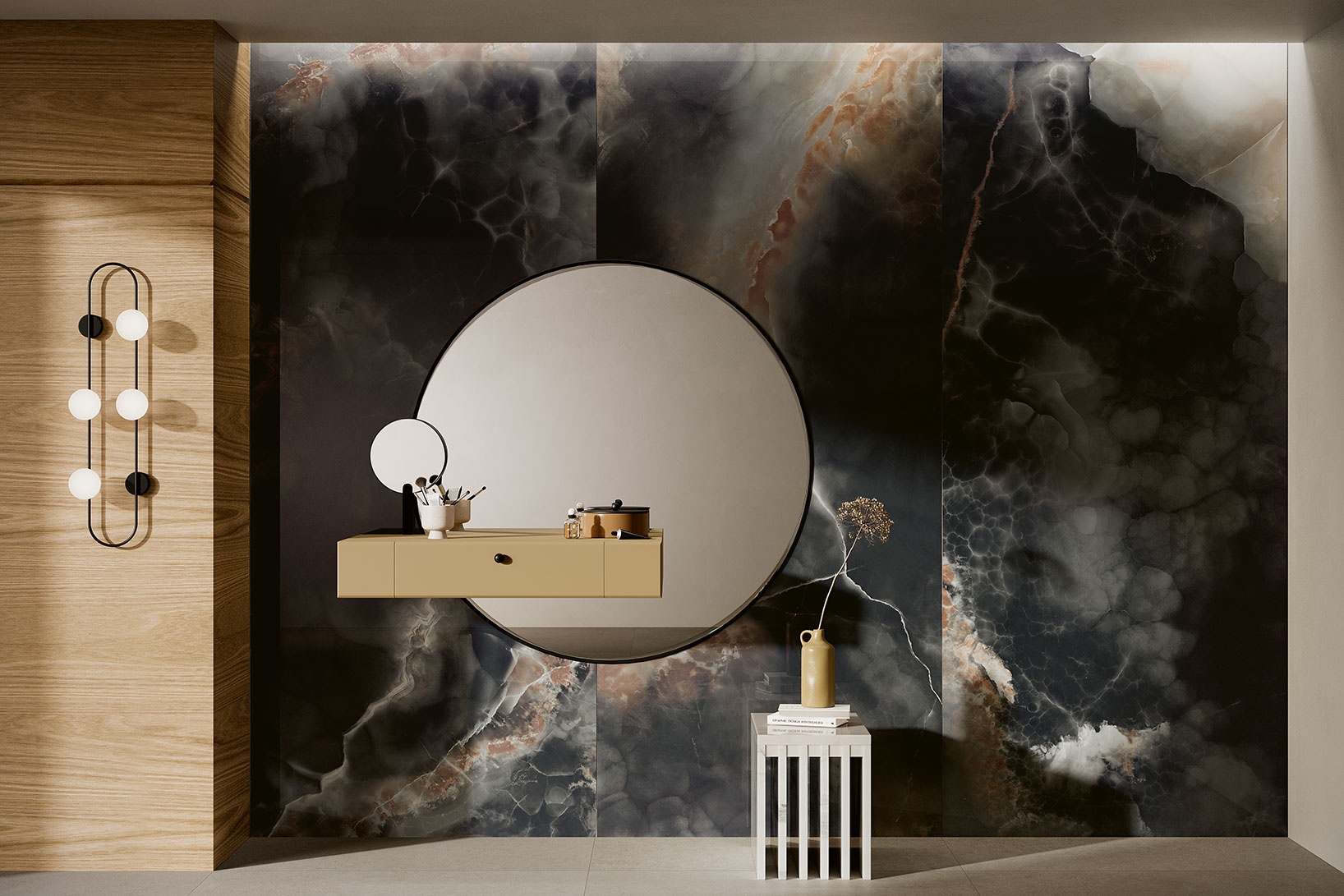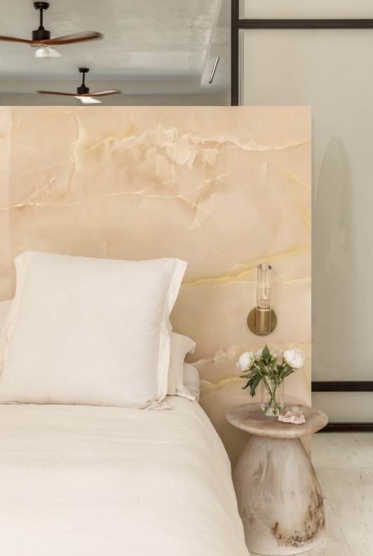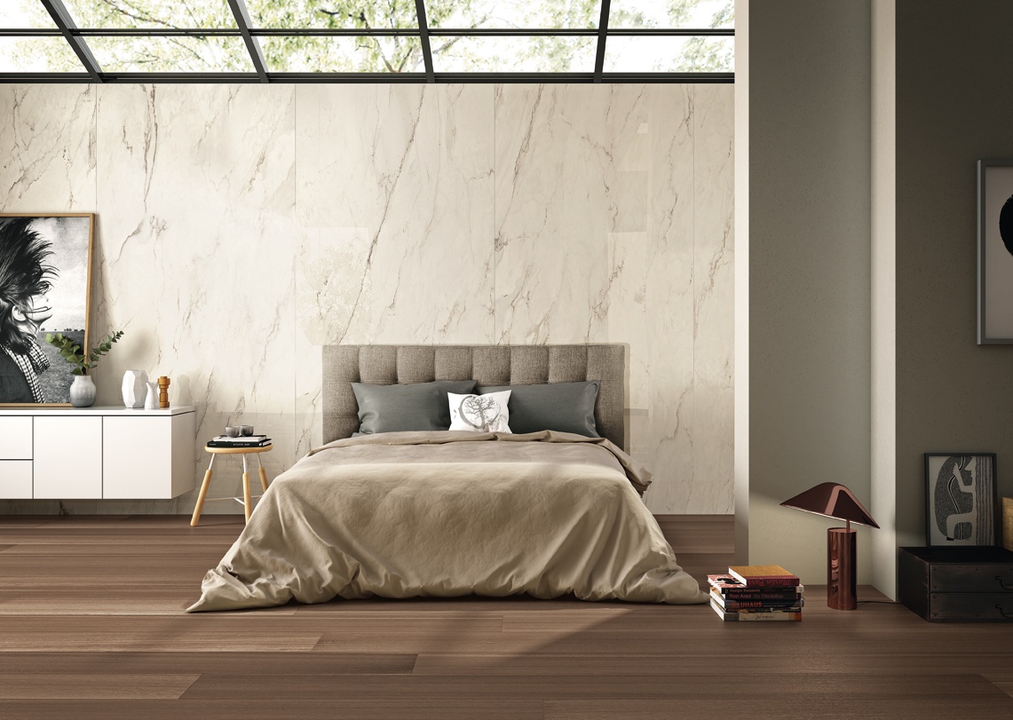 Utilisé en tête de lit, il devient un véritable élément décoratif, structurant l’espace et renforçant le caractère de la pièce. Au sol, ses grands formats et ses finitions soignées offrent une continuité visuelle raffinée, idéale pour les intérieurs contemporains.